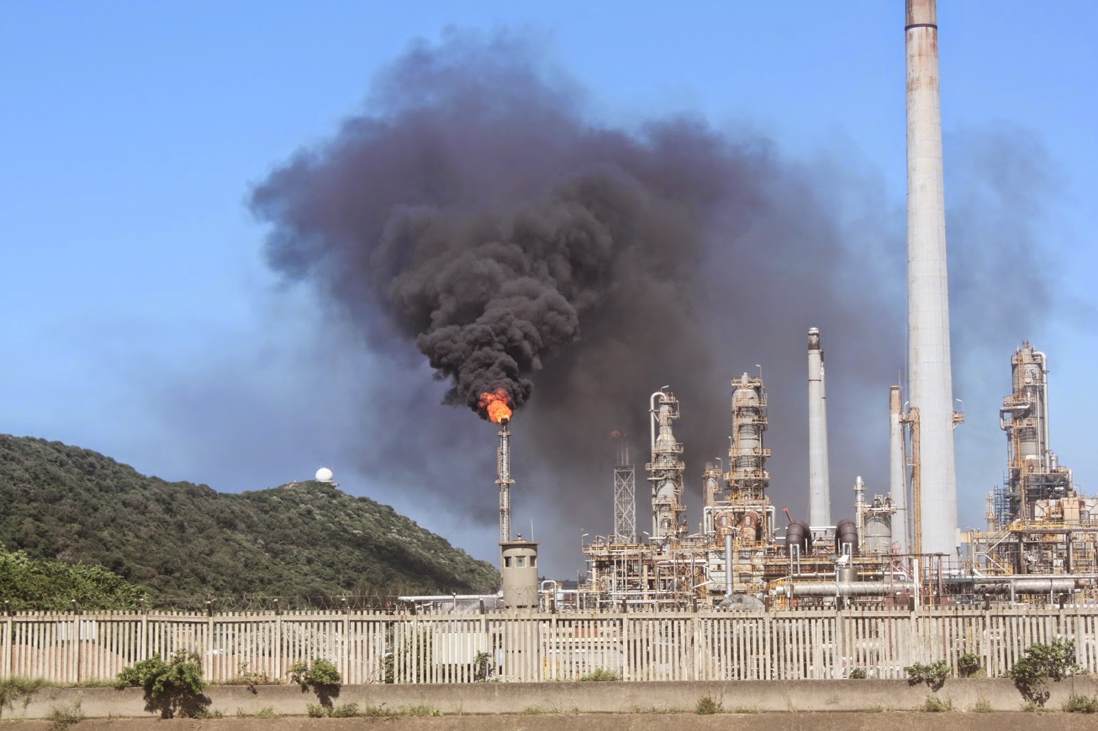 Flaring fires emerged from the Sapref Oil Refinery in South Durban on Wednesday morning, 1 April 2015. Two of the stacks were seen emitting flames and plumes of smoke that were appearing to head toward the Isipingo community. This toxic smoke causes a health risk for residents. At facilities nearby, water was being hosed onto tanks closest to the flares. The cause of the flaring is unknown.